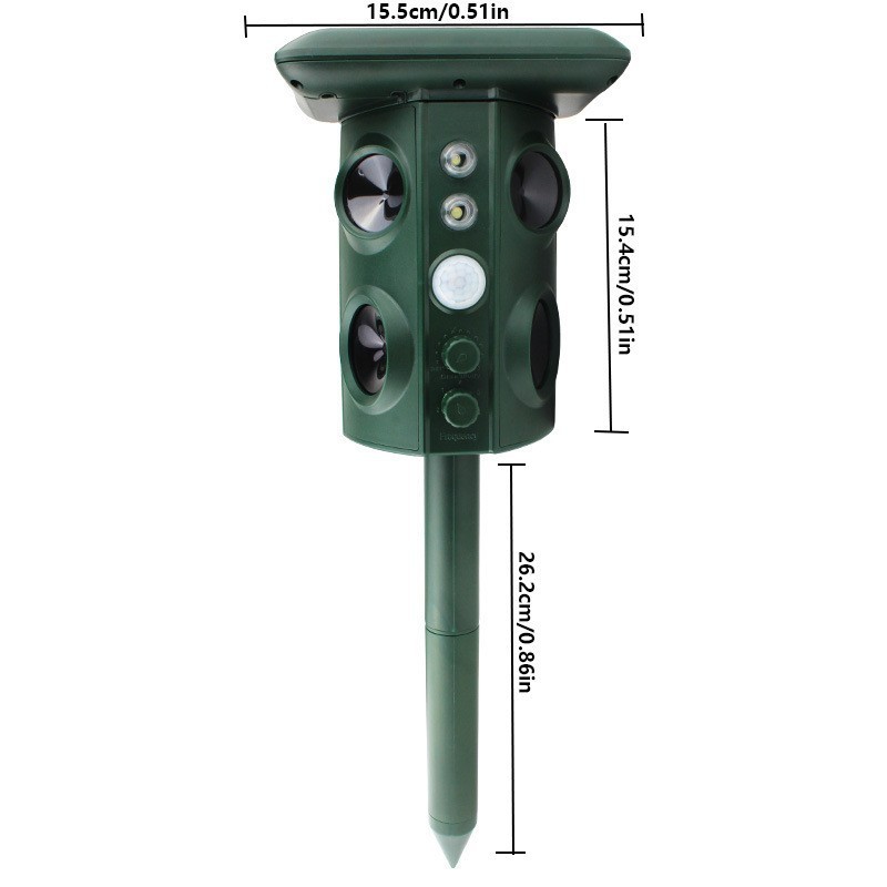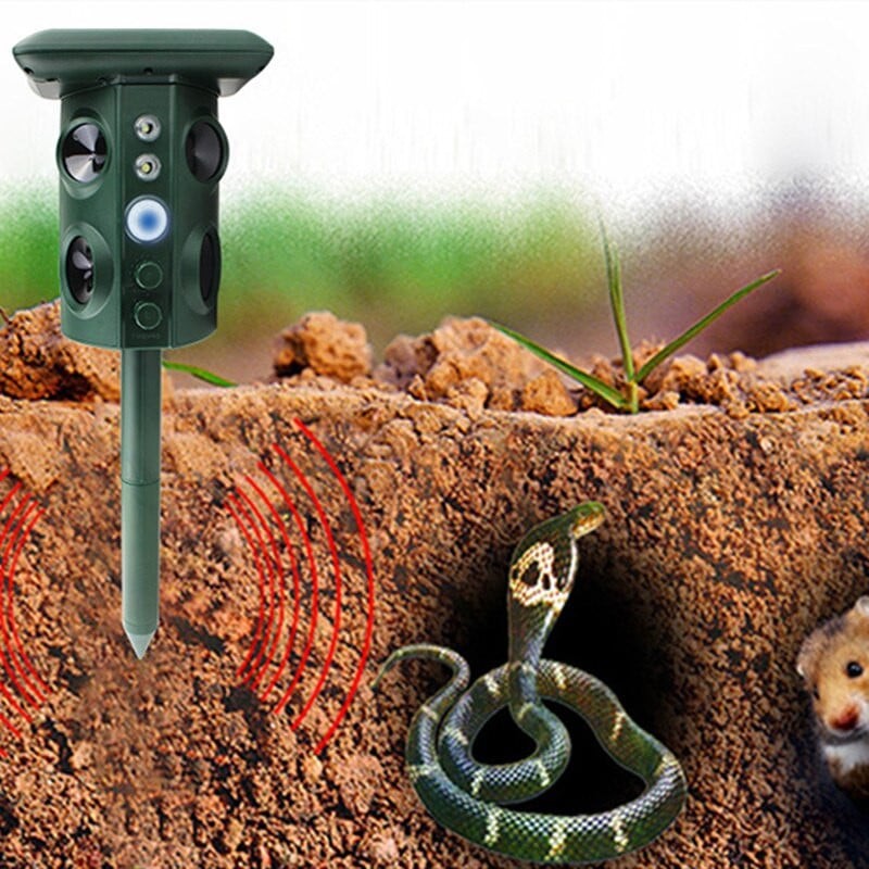 Repelent cu ultrasunete și vibrații: Dispozitivul emite ultrasunete și vibrații la frecvențe variabile (13.5 KHz – 45.5 KHz) pentru a respinge animale precum șerpi, câini, pisici, vulpi, mistreți, lilieci și rozătoare. Aceste frecvențe sunt intolerabile pentru animale, dar sigure pentru oameni și mediu.