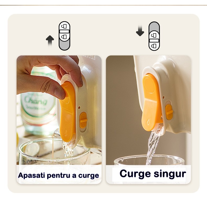 Design practic și etanș: Dozatorul este dotat cu un capac etanș, care asigură că lichidele rămân în interior și nu se scurg, evitând astfel dezordinea sau pierderile accidentale. De asemenea, duza de deschidere/inchidere permite un turnaj precis și controlat al băuturilor, astfel încât să puteți servi cantitatea dorită fără a risipi lichidul.