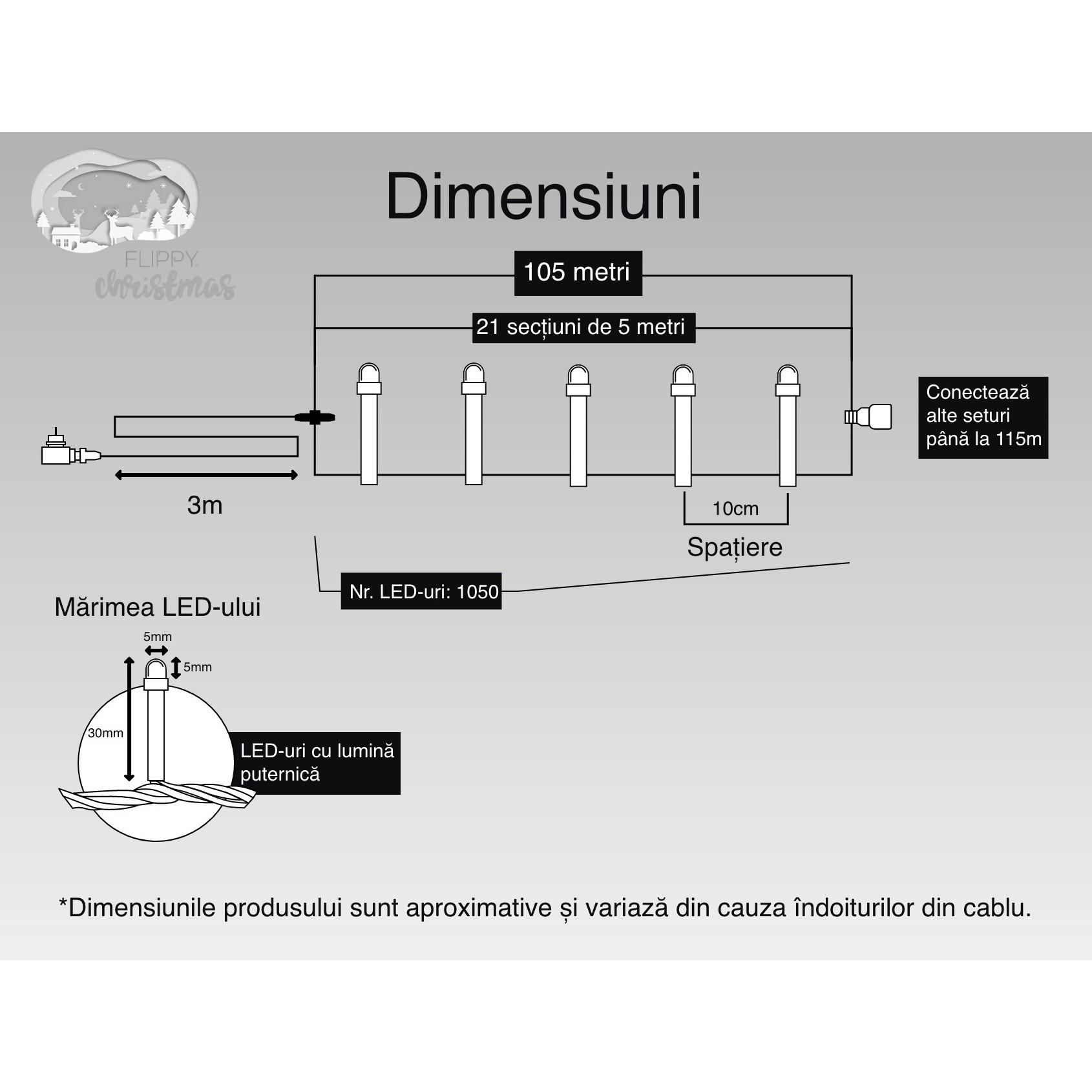 Instalatie Craciun, 105 m, 1050 Led-uri ,Liniara, Multicolor, 8 jocuri de lumini, Transformator, Interconectabila, Prelungitor 3 m inclus, Fir Transparent, Flippy