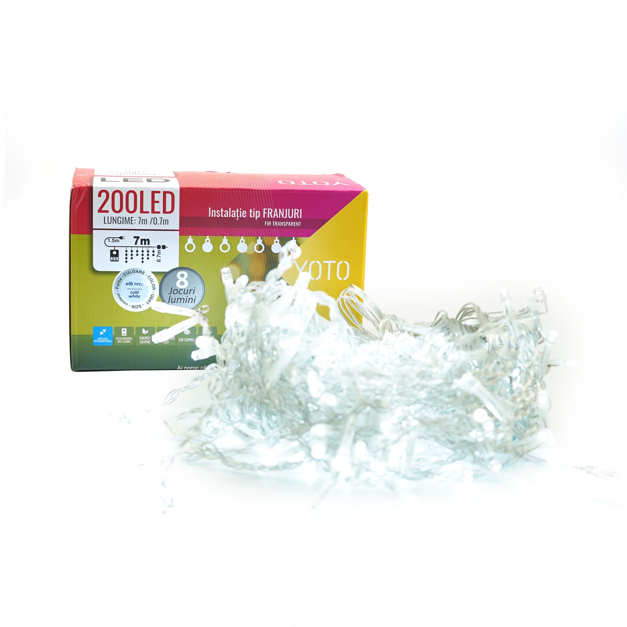 Cu bucurie! Imaginează-ți o scenă magică de Crăciun, în care fiecare colț al casei tale strălucește în lumina fermecătoare a Instalației de Crăciun Yoto, Tip Franjuri/Turturi. Cu o lungime de 7 metri și împodobită cu 200 de LED-uri luminoase, această instalație devine elementul central al decorului tău festiv.