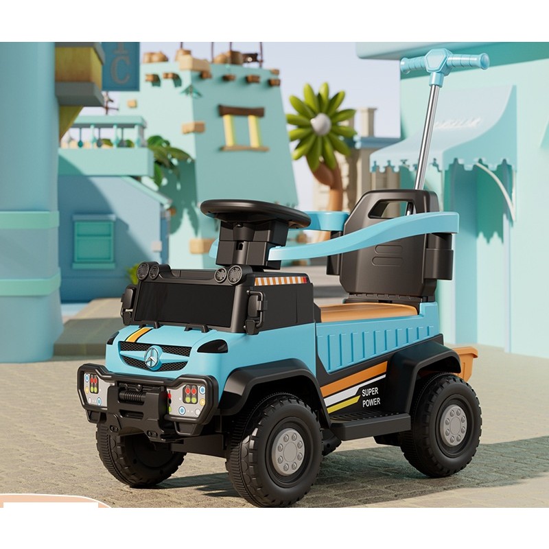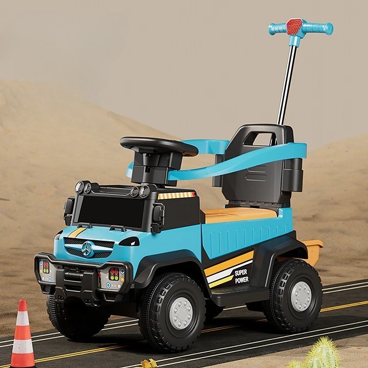 Masinuta Electrica, Flippy, pe 4 Roti, cu Telecomanda si Maner Detasabil, Cos de Depozitare, Lumini Led si Muzica, +1 an, Greutate Portanta 40 kg, Albastru