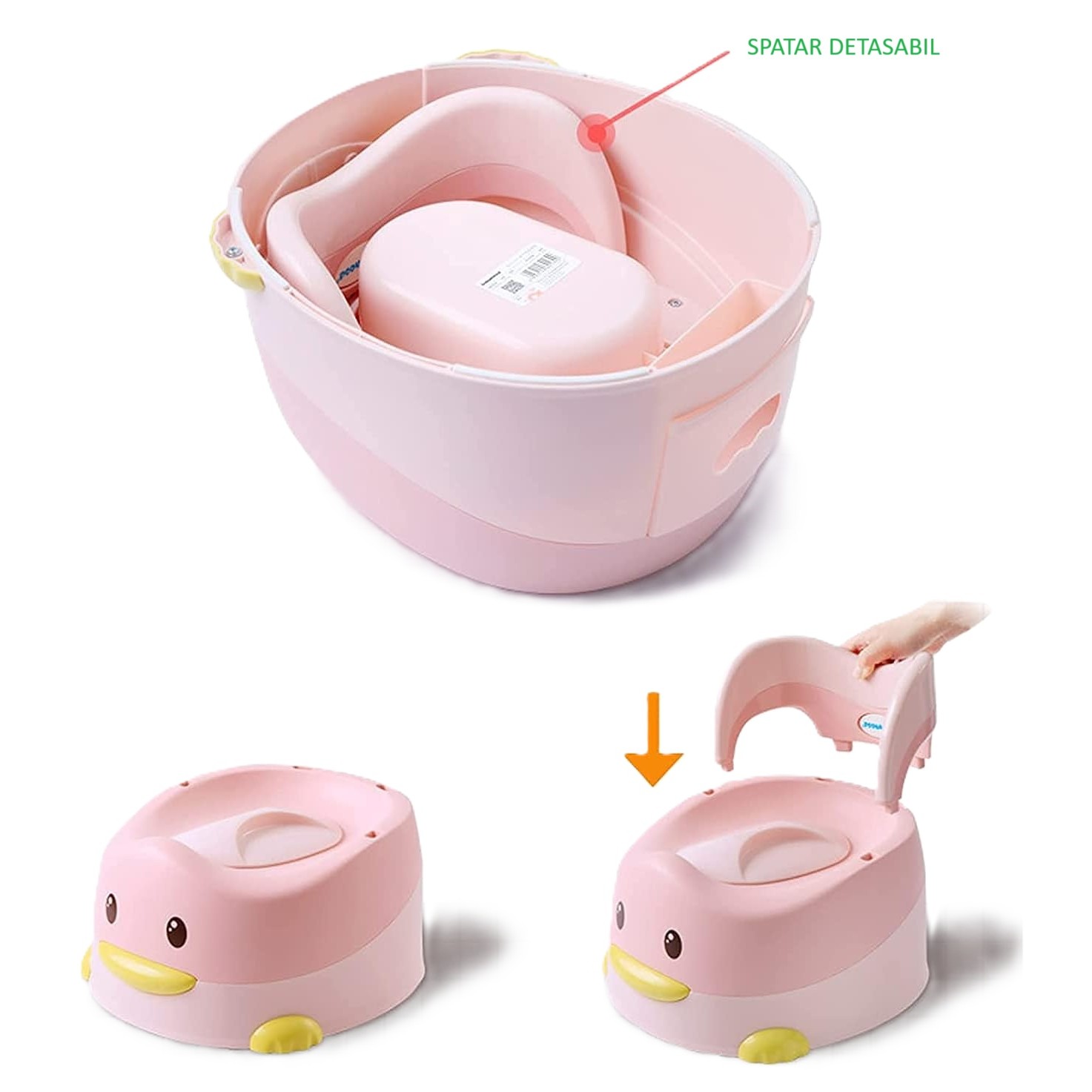 Oliță pentru Copii Flippy, +6 luni, Detasabilă, cu Capac, Antiderapantă, din Plastic, Colac Moale, Model Rățușcă, 38x32x30 cm