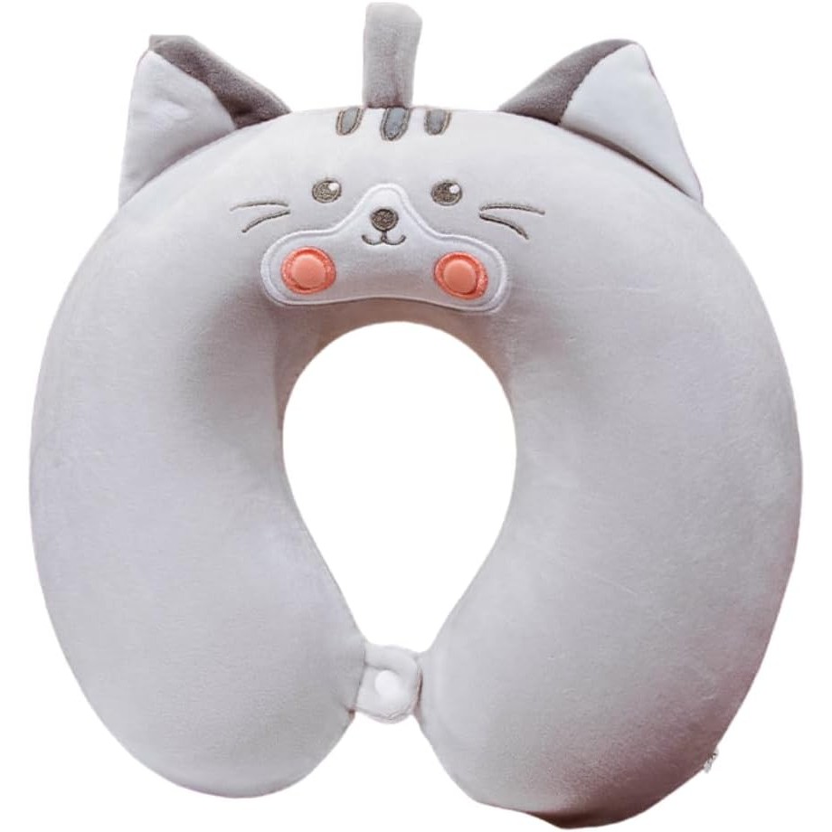 Perna de Calatorie in Forma de U, Flippy, Pentru Gat si Cap, Umplutura din Spuma cu Memorie, 30×30 cm, Model Pisica, Accesoriu de Voiaj, Birou, Masina, Sistem Prindere Capse, Gri