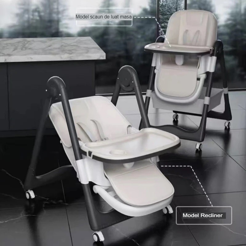 -Scaunul pentru copii cu 8 trepte ale înălțimii, 2 tăvi pentru farfurii retractabile.