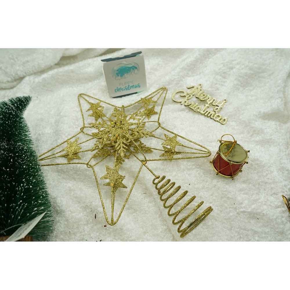 Cantitate Varf decorativ de brad, Auriu, in forma de Stea, design de stele, din Plastic/Metal, 25 cm x 27 cm, Interior/Exterior, Flippy