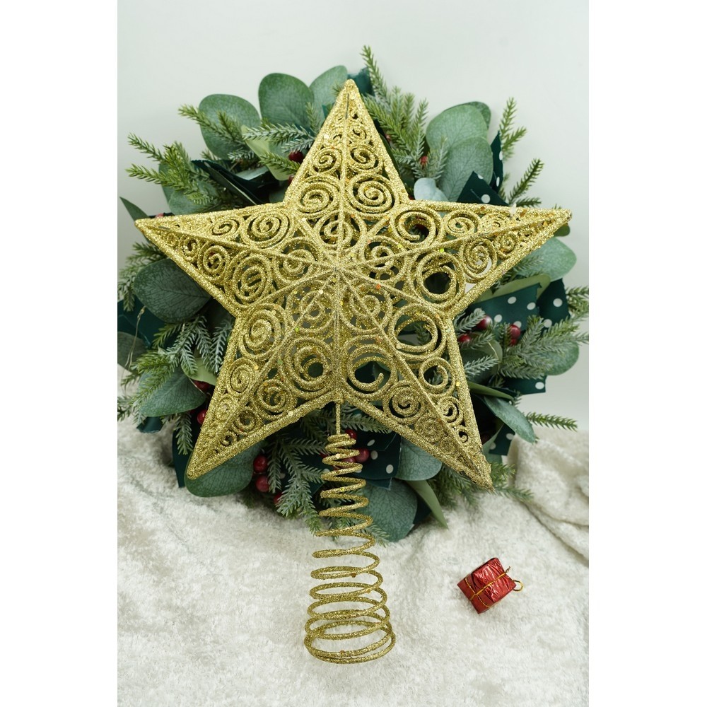 Cantitate Varf decorativ de brad, Auriu, in forma de Stea, design spiralat, din Plastic/Metal, 29 cm x 38 cm, Interior/Exterior, Flippy